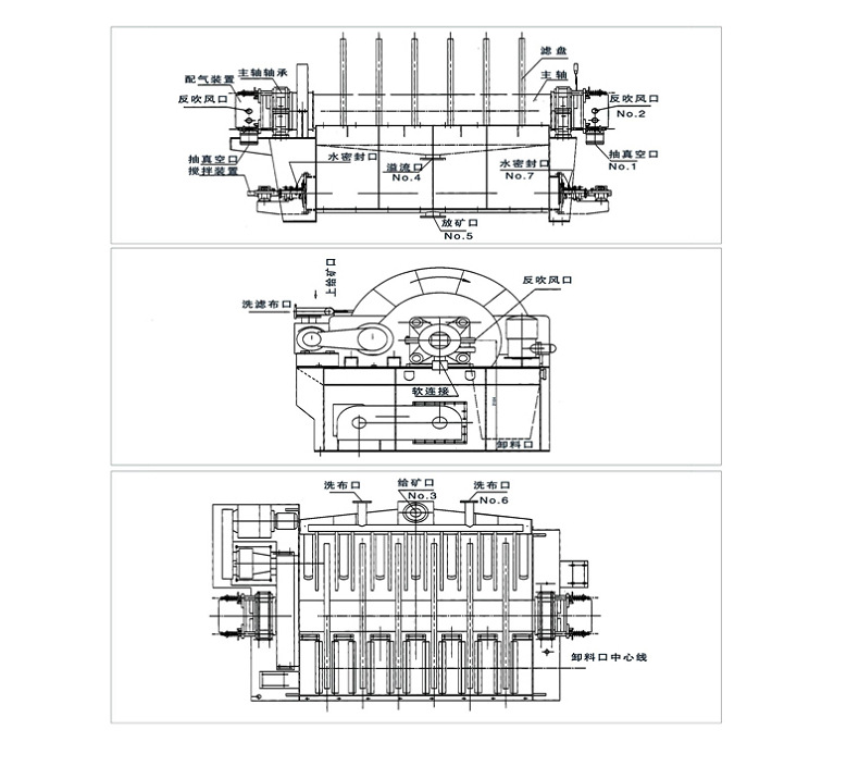 盤式真空過濾機由各個單獨的扇形片的圓盤構(gòu)成。每一個扇形片為 單獨的過濾單元,由濾布做成布套在扇形片上形成濾室。過濾盤由電機通過減速器及開式齒輪傳動來驅(qū)動 ,過濾盤順時針方向轉(zhuǎn)動,濾室里的礦漿在吸附區(qū)借助于真空泵在過濾介質(zhì)兩側(cè)形成的壓力差,附著在過 濾盤上形成濾餅后,攪拌器旋轉(zhuǎn)防止固體沉淀,濾餅離開液面后,在真空作用下繼續(xù)脫去水分。濾液透過 濾布,經(jīng)過濾液管,從分配頭排出。濾餅在卸料區(qū)由反吹風卸料落入排料槽,整個作業(yè)過程連續(xù)循環(huán)進行 。